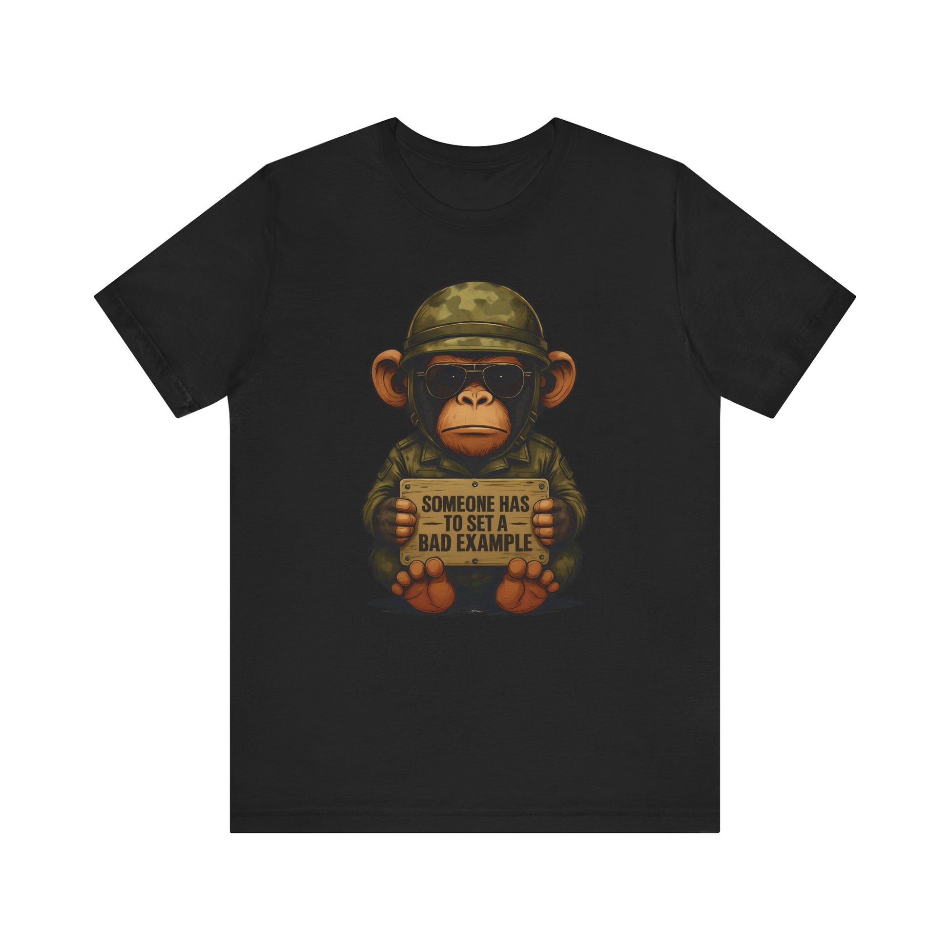 A funny military monkey bad influence T-Shirt that adds a playful and lighthearted vibe to your wardrobe. Perfect for those who enjoy humor and unique designs. Ideal for casual wear, lounging, or as a conversation starter. Relevant for occasions like birthdays, holidays, or military-themed events.